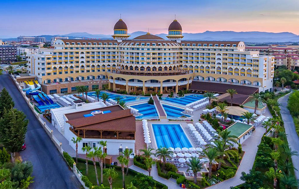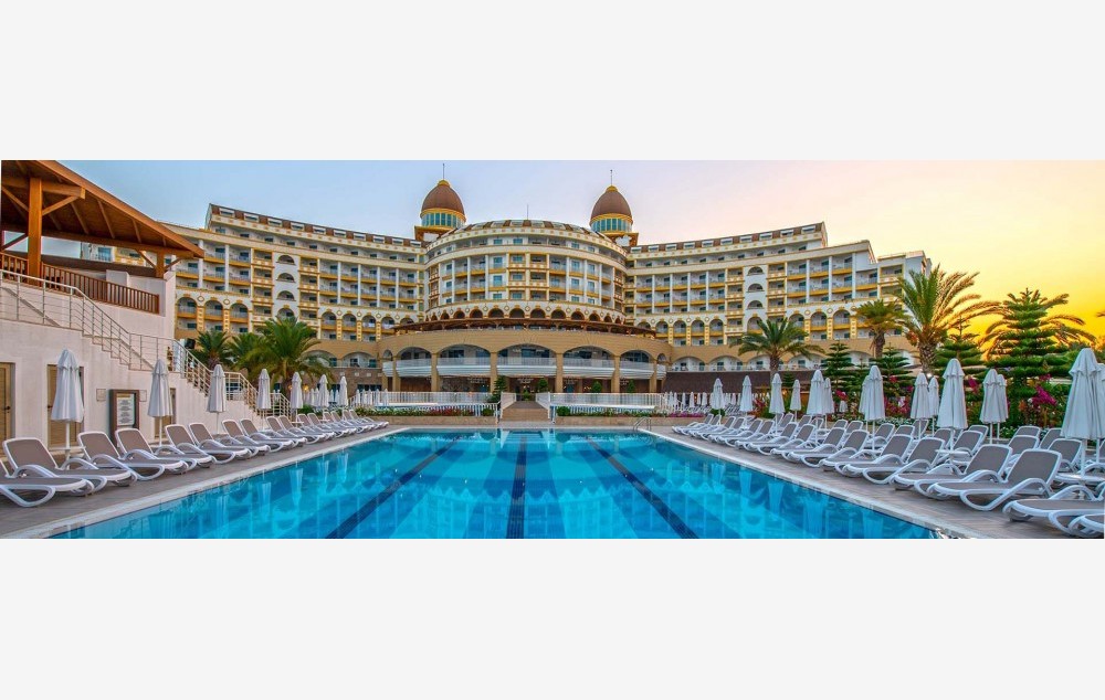 Hotelski sadržaj: Recepcija, 2 glavna restorana, 2 a la carte restorana, dijetalni meni, 13 barova, 2 unutrašnja i 5 spoljašnjih bazena, 5 dečijih bazena, 6 đakuzija, akva park sa 19 tobogana (10 dečijih), bioskopska sala, dnevne i večernje animacije, mini klub (za decu od 4-12 godina), teenage klub (za decu od 13-17 godina), mini disko, igraonica, aerobic u vodi, bocanje, pikado, stoni tenis, odbojka na pesku, teniski teren, košarka, tursko veče, hamam, sauna, parna soba, teretana, bilijar (uz doplatu), wi fi (u lobiju).