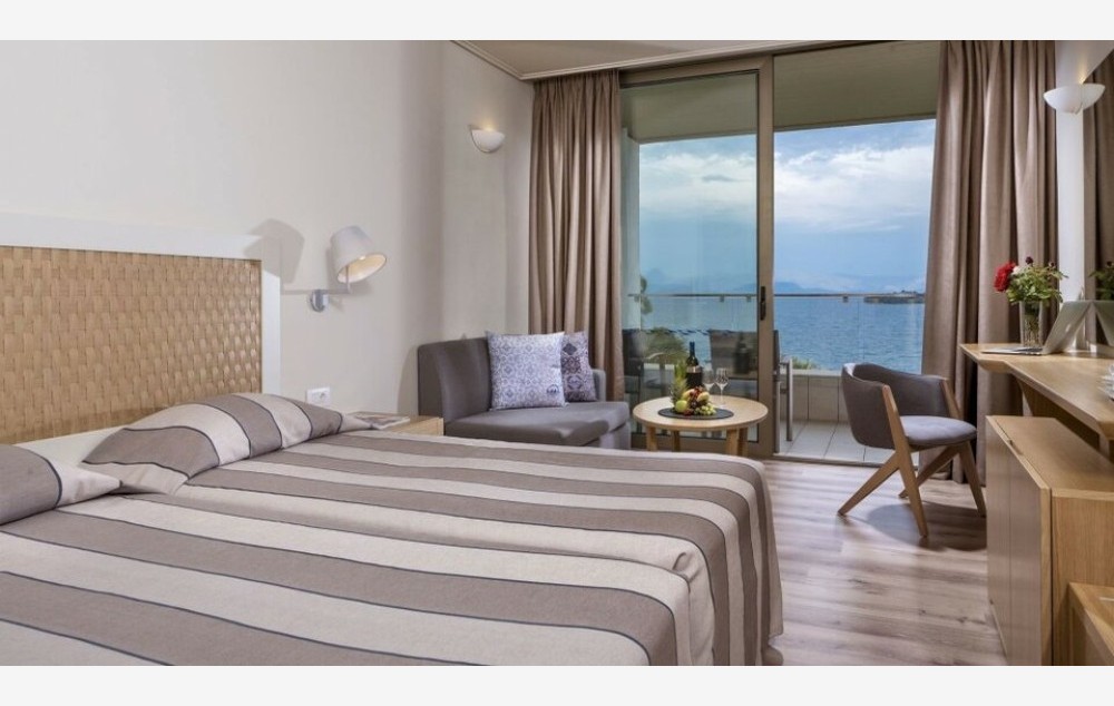 Standard room main building bay view-23 m2, sa pogledom na Marinu Guviju i zelena brda Krfa, ima bračni ili dva odvojena kreveta sa sofom na razvlačenje za 3. osobu.