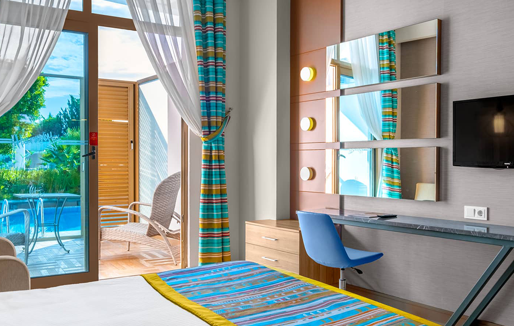 Smeštaj: Hotelski kompleks čine glavna sedmospratna zgrada i pet dvospratnih vila koje imaju ukupno 358 soba. U glavnoj zgradi se nalaze standardne sobe sa pogledom na kopno ili more i porodične sobe, dok se u vilama nalaze vila standardne sobe i vila porodične sobe. Hotel poseduje i sobe za osobe sa posebnim potrebama.