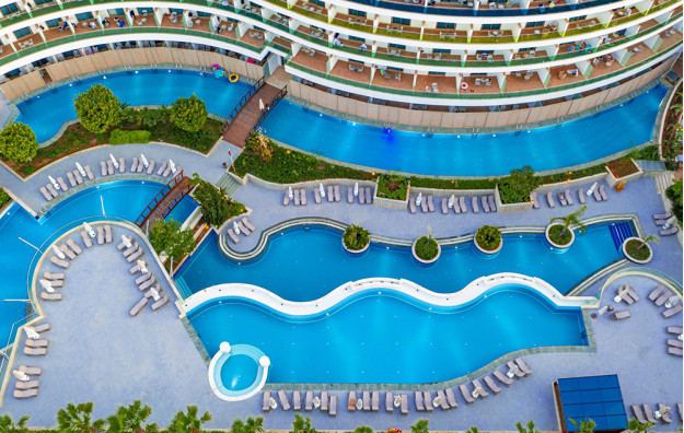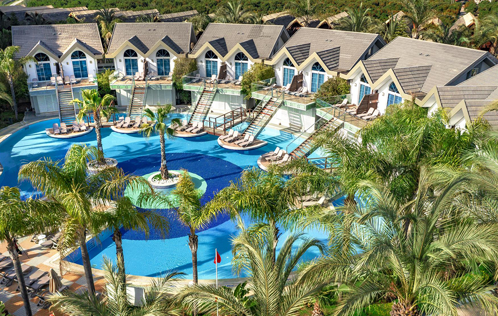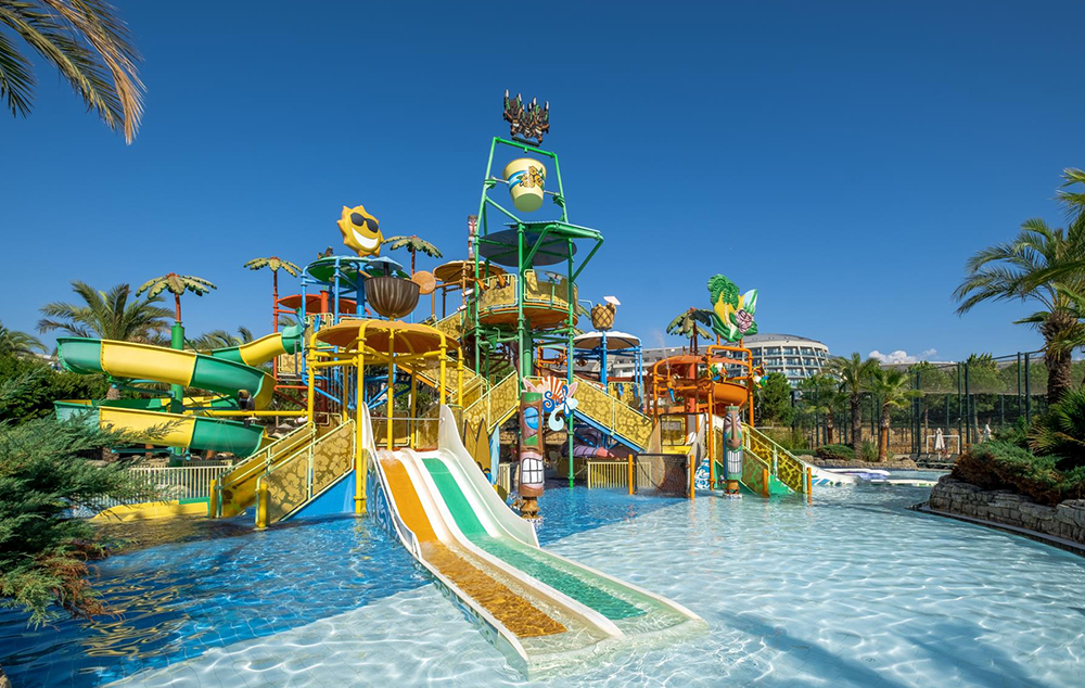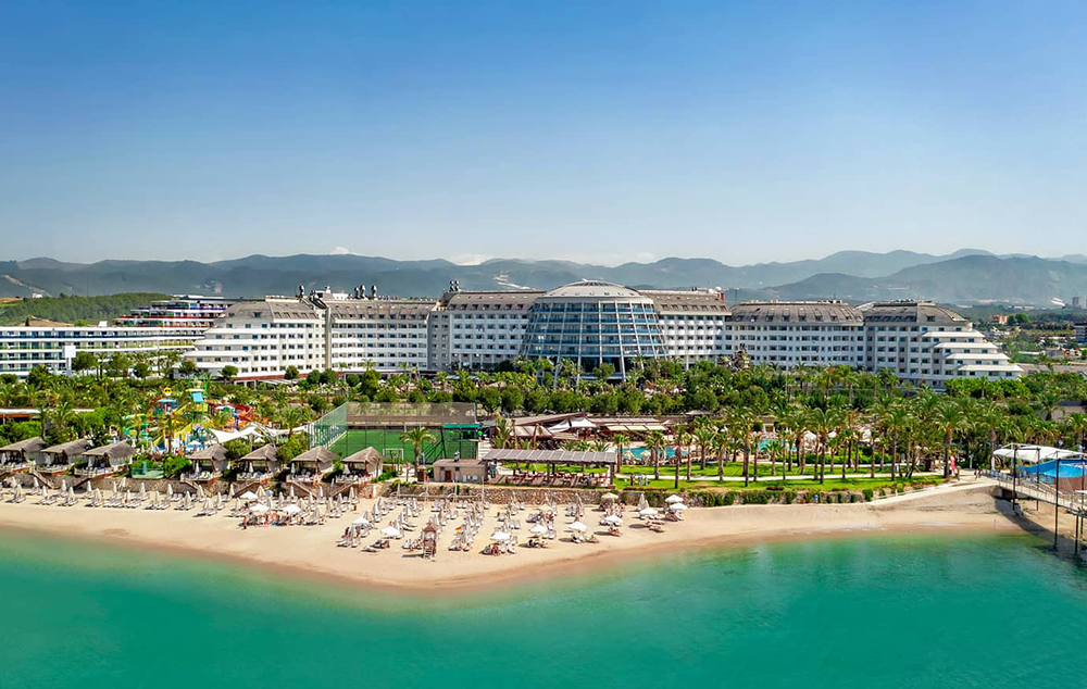 Hotelski sadržaj: Recepcija, 2 glavna restorana, 2 a la carte restorana, dijetalni meni, 13 barova, 2 unutrašnja i 5 spoljašnjih bazena, 5 dečijih bazena, 6 đakuzija, akva park sa 19 tobogana (10 dečijih), bioskopska sala, dnevne i večernje animacije, mini klub (za decu od 4-12 godina), teenage klub (za decu od 13-17 godina), mini disko, igraonica, aerobic u vodi, bocanje, pikado, stoni tenis, odbojka na pesku, teniski teren, košarka, tursko veče, hamam, sauna, parna soba, teretana, bilijar (uz doplatu), wi fi (u lobiju).
