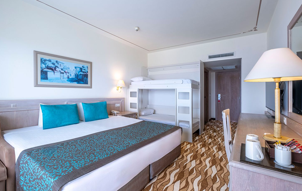 Standard sobe sa krevetima na sprat pogled kopno, bašta, delimično more ili more (26m2). Sadrže francuski ležaj ili 2 odvojena ležaja i krevete na sprat. Maksimalno mogu da borave četiri odrasle osobe.