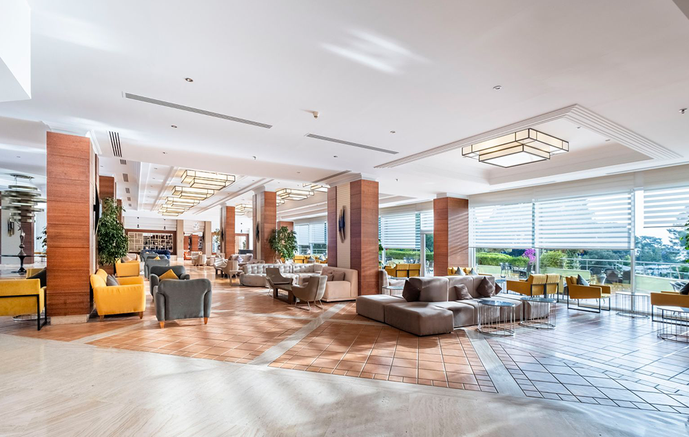 Hotelski sadržaj: Recepcija, 2 glavna restorana, 2 a la carte restorana, dijetalni meni, 13 barova, 2 unutrašnja i 5 spoljašnjih bazena, 5 dečijih bazena, 6 đakuzija, akva park sa 19 tobogana (10 dečijih), bioskopska sala, dnevne i večernje animacije, mini klub (za decu od 4-12 godina), teenage klub (za decu od 13-17 godina), mini disko, igraonica, aerobic u vodi, bocanje, pikado, stoni tenis, odbojka na pesku, teniski teren, košarka, tursko veče, hamam, sauna, parna soba, teretana, bilijar (uz doplatu), wi fi (u lobiju).