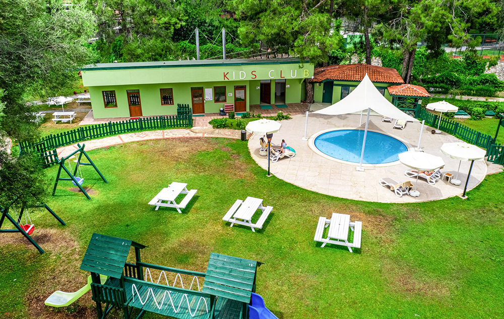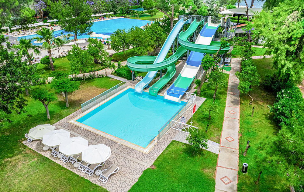 Hotelski sadržaj: Recepcija, glavni restoran, 2 a la carte restorana (turski i riblji-besplatno jednom u toku boravka uz rezervaciju), 2 bara, poslastičarnica, bazen za odrasle, dečiji bazen, aqua park sa 3 tobogana, dečiji klub (od 4-12 god.), dečije igralište, dnevne i večernje animacije, tursko kupatilo, sauna, fitnes, aerobik, košarka, boćanje, odbojka na plaži, mini fudbal, stoni tenis, teniski teren, pikado, wi fi.
