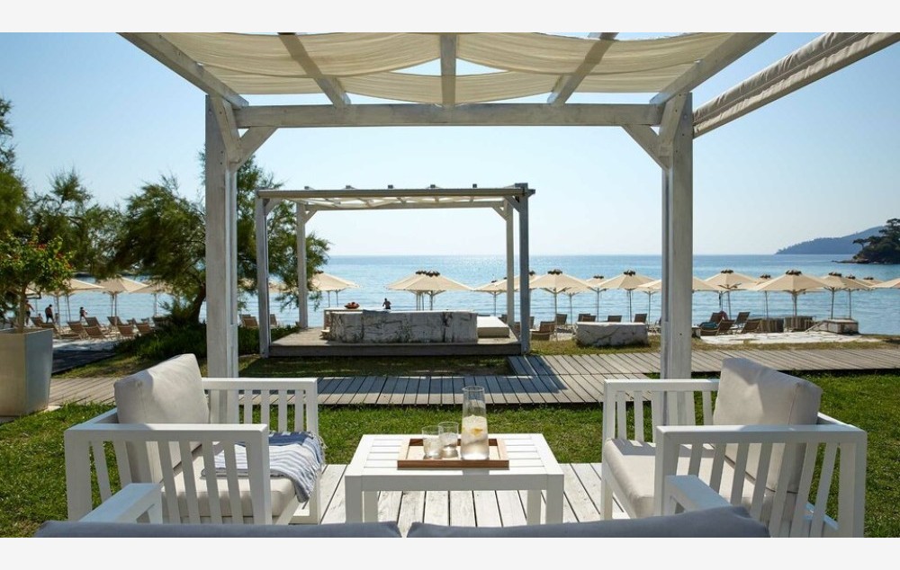 Seafront Deluxe Room-24 m2, na ekskluzivnom mestu, odmah iznad plaže Makriammos, 6 deluk soba na obali mora imaju bračni ili dva odvojena kreveta i sofu na razvlačenje, privatna kupatila sa tušem i nameštenu verandu sa pogledom na more.