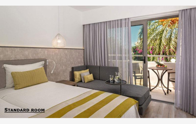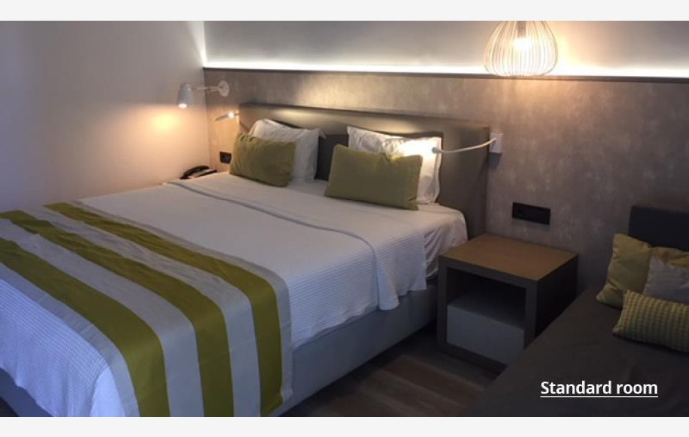 Hotel svojim gostima nudi veoma udoban smeštaj u renoviranim standardnim sobama koje imaju pogled na kopno mogu da prime troje odraslih ili dvoje odraslih i dvoje dece (sadrže francuski ležaj ili dva standardna ležaja, kao i dodatni ležaj za potrebe treće ili četvrte osobe). Sve sobe su po svojoj osnovnoj strukturi dvokrevetne dok ostali ležajevi mogu biti pomoćni, imaju centralnu klimu,  direktnu telefonsku liniju, Wi-Fi internet (besplatno), sef (uz doplatu 3 eur dnevno), SAT TV, mini frižider, flaširana voda se menja svakodnevno, set za kafu i čaj, kupatilo sa kadom ili tuš kadom, fen, balkon ili terasu.
