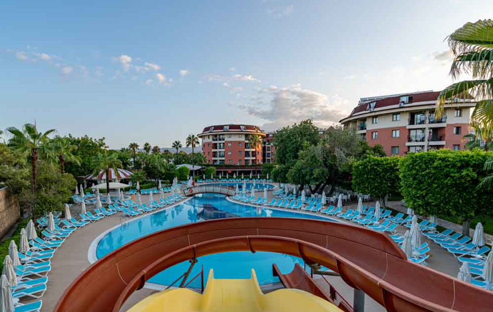 Hotelski sadržaj: Recepcija, 2 glavna restorana, 2 a la carte restorana, dijetalni meni, 13 barova, 2 unutrašnja i 5 spoljašnjih bazena, 5 dečijih bazena, 6 đakuzija, akva park sa 19 tobogana (10 dečijih), bioskopska sala, dnevne i večernje animacije, mini klub (za decu od 4-12 godina), teenage klub (za decu od 13-17 godina), mini disko, igraonica, aerobic u vodi, bocanje, pikado, stoni tenis, odbojka na pesku, teniski teren, košarka, tursko veče, hamam, sauna, parna soba, teretana, bilijar (uz doplatu), wi fi (u lobiju).