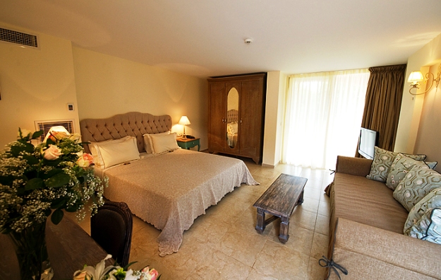Grand Bliss Suite – oko 45m2 sa pogledom na baštu ili bazen. Sastoji se od jedne prostrane spavaće sobe sa francuskim ili dva odvojena ležaja I odvojene dnevne sobe u opušteno luksuznom stilu. Namenjen za 5 osoba.