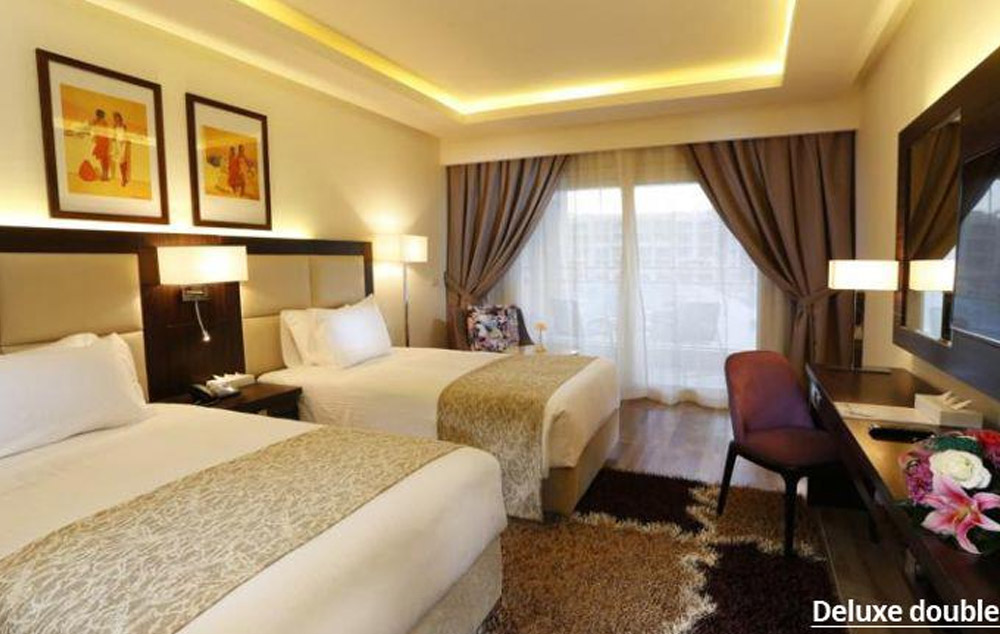 Raspolaže sa ukupno 473 smeštajnih jedinica, od toga su 411 standardne deluxe sobe, 54 junior suite i 8 suite-ova. Standardne deluxe sobe su površine oko 40m2, junior suite površine oko 70m2 (kupatilo sa tuš kabinom i đakuzi kadom), suite površine 90m2-120m2 sastoji se od spavaće sobe i dnevnog boravka (kupatilo je sa tuš kabinom i đakuzi kadom). Sobe su prostrane, moderno uređene i sadrže: kupatilo sa tuš kabinom/kadom, fen za kosu, LCD sat TV, telefon, mini bar, klima uređaj, ketler za kafu/čaj, sef, besplatan Wi Fi internet, balkon ili terasu.