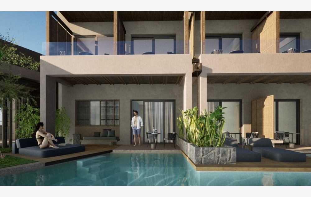 Suite Private Pool - 40 m², savršeno utočište u ovom elegantnom apartmanu u prizemlju s dva prostrana dela - spavaćom sobom s bračnim krevetom i dnevnim boravkom s kaučima na razvlačenje, sopstvenim kupatilom s tušem i nameštenom terasom s privatnim bazenom, okruženom mirnim pogledom na vrt.