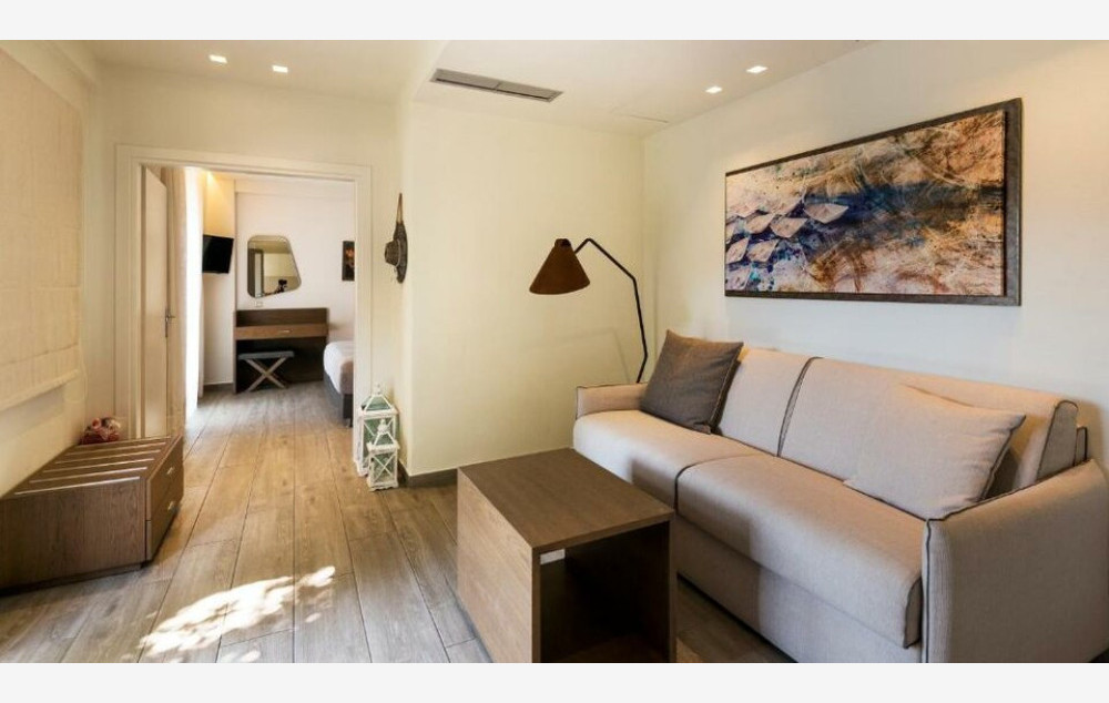 Deluxe Suite with Side Sea View - 35-40 m2, udoban apartman s odvojenom spavaćom sobom s bračnim krevetom i dnevnim boravkom s kaučem na razvlačenje, sopstvenim kupatilom sa tušem i nameštenim balkonom s bočnim pogledom na Jonsko more.
