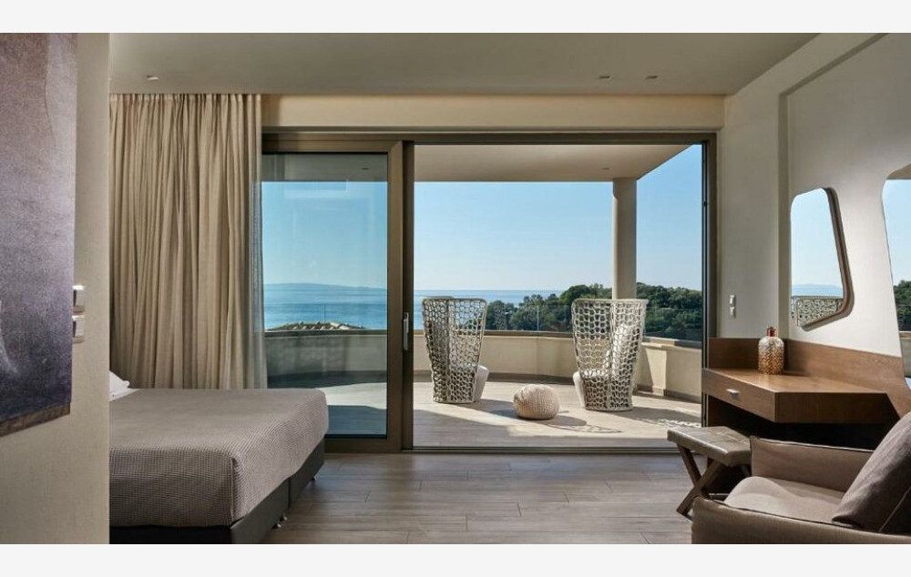 Luxury Veranda Suite Sea View - 40 m², s odvojenom spavaćom sobom s bračnim krevetom i dnevnim boravkom s kaučima na razvlačenje, koji se proteže na veliku nameštenu verandu s prekrasnim pogledom na more.