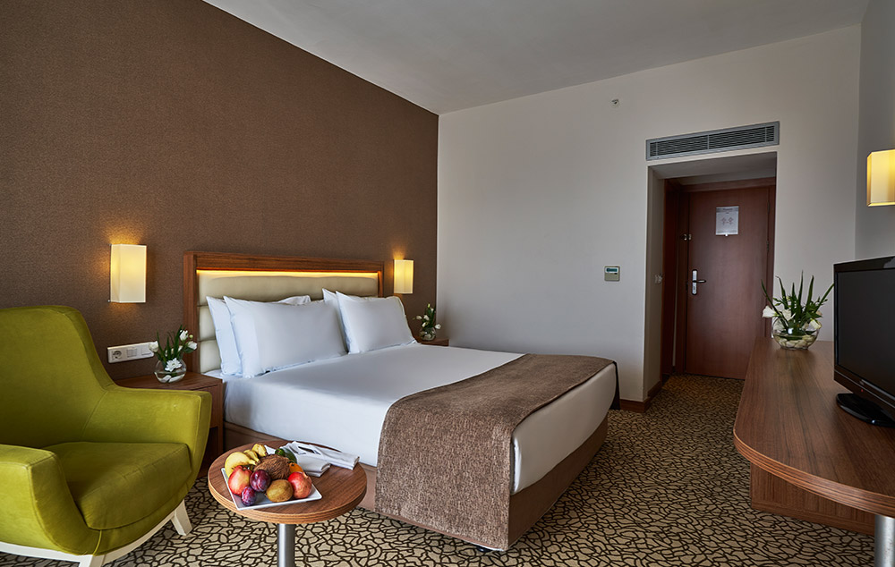 Sobe: Hotelski kompleks se sastoji od glavne zgrade i klub zgrade i raspolaže sa 264 sobe. U glavnoj zgradi se nalaze 144 standardne sobe sa pogledom na kopno ili na more, površine 27m². Sve sobe su klimatizovane, imaju SATTV, mini bar (besplatno – voda i bezalkoholna pića), sef (uz doplatu), tuš, fen, telefon, balkon. Maksimalno borave 3 odrasle osobe. Porodične sobe su površine 32 m² i isto su opremljene kao standard sobe. Sastoje se iz dve prostorije odvojene vratima. Maksimalno borave 3 odrasle osobe i 1 dete od 12 godina. Family sobe u glavnoj zgradi nemaju balkon. U klub zgradi se nalazi 75 Club soba, površine 25 m², isto su opremljene kao standard sobe. Maksimalno borave 3 odrasle osobe.