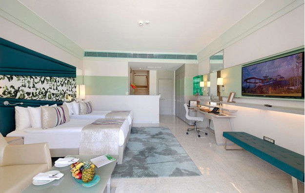 Hotelski sadržaj: Recepcija, 2 glavna restorana, 2 a la carte restorana, dijetalni meni, 13 barova, 2 unutrašnja i 5 spoljašnjih bazena, 5 dečijih bazena, 6 đakuzija, akva park sa 19 tobogana (10 dečijih), bioskopska sala, dnevne i večernje animacije, mini klub (za decu od 4-12 godina), teenage klub (za decu od 13-17 godina), mini disko, igraonica, aerobic u vodi, bocanje, pikado, stoni tenis, odbojka na pesku, teniski teren, košarka, tursko veče, hamam, sauna, parna soba, teretana, bilijar (uz doplatu), wi fi (u lobiju).