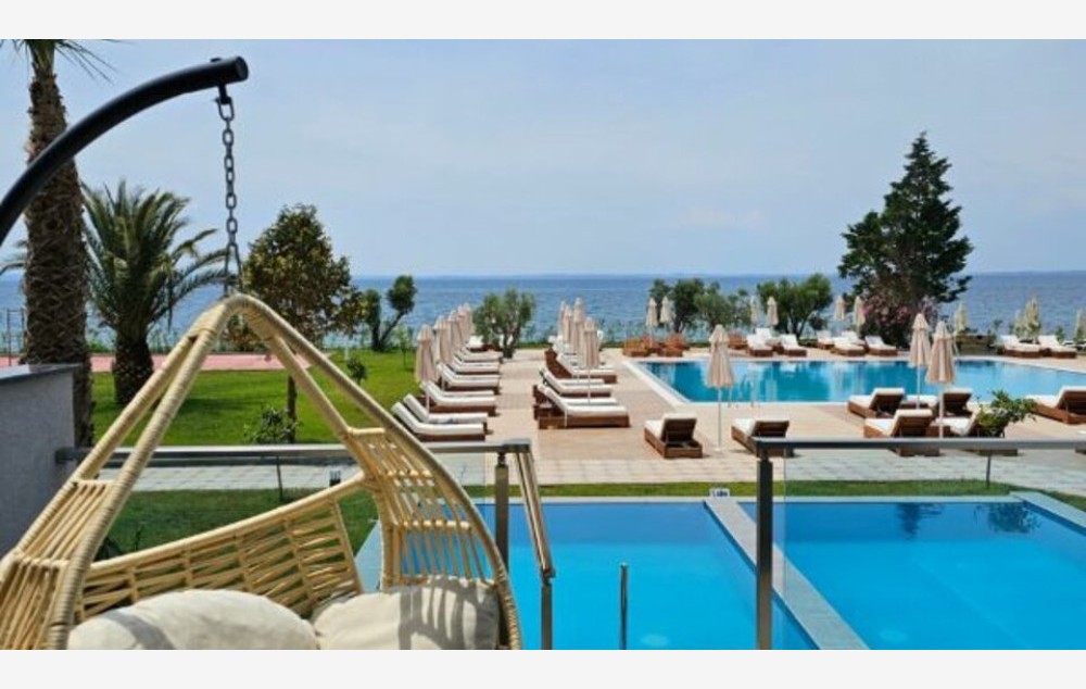 Deluxe Room Sharing Pool-24 m2, na nekoliko koraka od tirkiznih voda Toroneosa. Ove sobe imaju bračni ili dva odvojena kreveta i dodatni krevet za jednu osobu, sopstveno kupatilo I nameštenu terasu s prisupom zajedničkom bazenu.