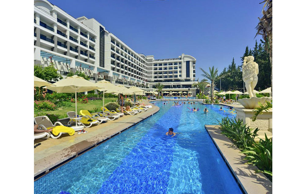 Hotelski sadržaj: Recepcija, 2 glavna restorana, 2 a la carte restorana, dijetalni meni, 13 barova, 2 unutrašnja i 5 spoljašnjih bazena, 5 dečijih bazena, 6 đakuzija, akva park sa 19 tobogana (10 dečijih), bioskopska sala, dnevne i večernje animacije, mini klub (za decu od 4-12 godina), teenage klub (za decu od 13-17 godina), mini disko, igraonica, aerobic u vodi, bocanje, pikado, stoni tenis, odbojka na pesku, teniski teren, košarka, tursko veče, hamam, sauna, parna soba, teretana, bilijar (uz doplatu), wi fi (u lobiju).