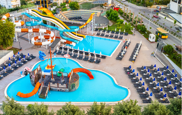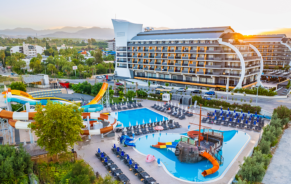 Hotelski sadržaj: Recepcija, glavni restoran, 2 a'la carte restorana, 4 bara, spoljašnje i unutrašnje bazene za decu, kao i bazene sa toboganima za odrasle i decu, amfiteatar, animacije, spa centar, tursko kupatilo, sauna, masaže (uz doplatu), fitnes centar, mini club za decu od 4-13 godina, dečije igralište, game room, bioskop, prodavnice, pikado, teniski tereni.