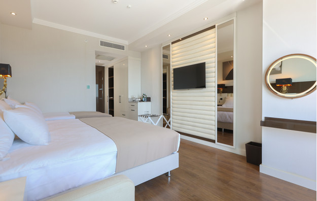 Deluxe sobe pogled more (26-30m2). Sadrže francuski ležaj ili 2 odvojena ležaja. Dodatni ležaj je sofa ili krevet na rasklapanje. Maksimalno mogu da borave tri odrasle osobe i jdno dete do 12 godina.