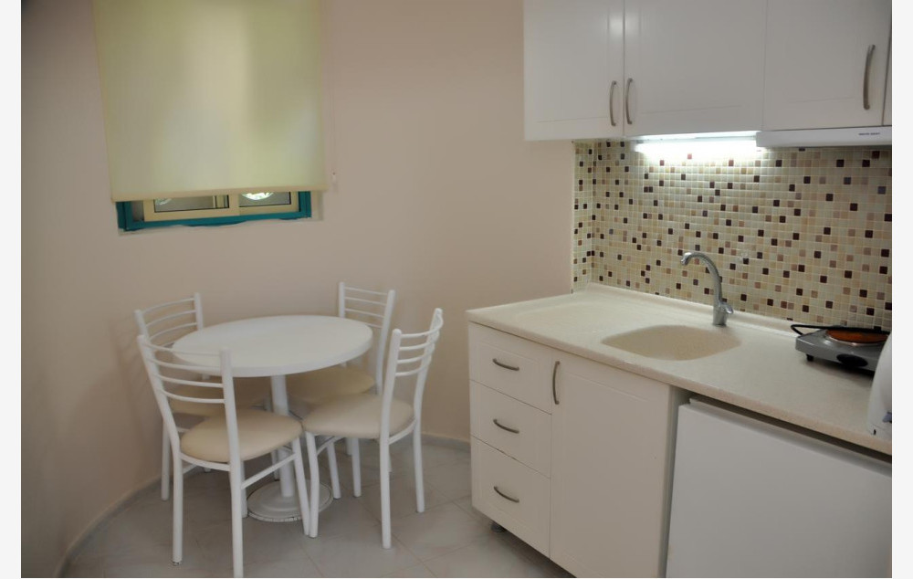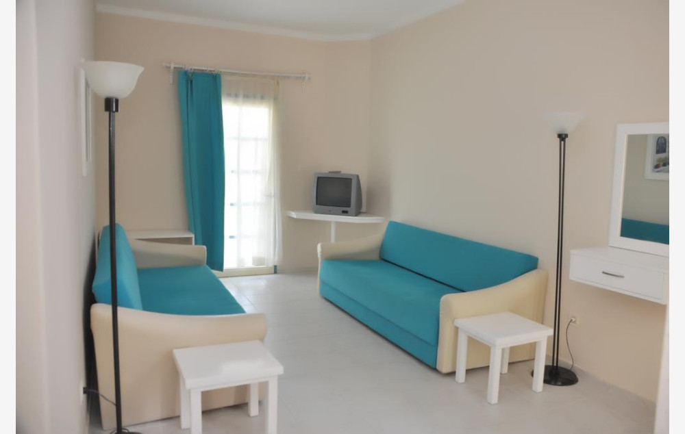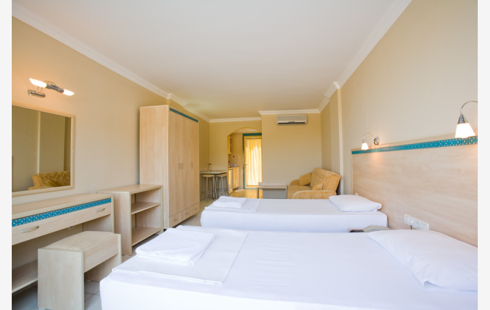 Studio sobe su veličine oko 30m2 i imaju kupatilo (tuš-wc, fen za sušenje kose), sat TV, telefon, klimu (uz doplatu-9eur po danu, po sobi), mini bar, sto i stolice, mini kuhinja, francuski balkon ili balkon, wifi. Maksimalno borave 2 odrasle osobe i 1 dete do 3 godine.