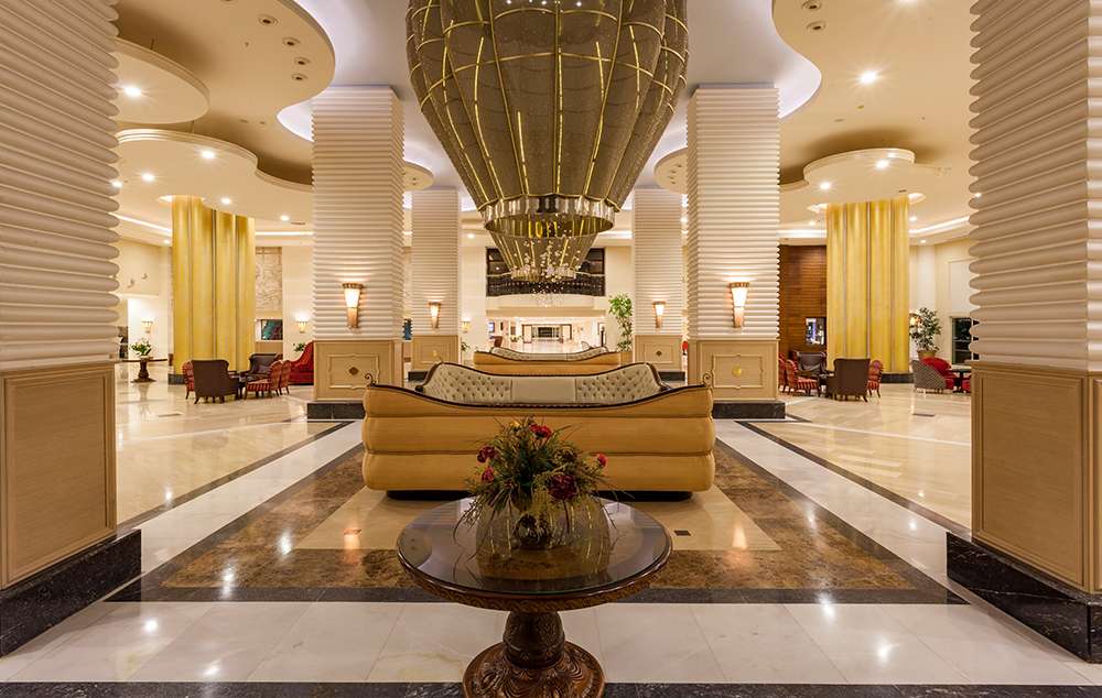Hotelski sadržaj: Recepcija, 2 glavna restorana, 2 a la carte restorana, dijetalni meni, 13 barova, 2 unutrašnja i 5 spoljašnjih bazena, 5 dečijih bazena, 6 đakuzija, akva park sa 19 tobogana (10 dečijih), bioskopska sala, dnevne i večernje animacije, mini klub (za decu od 4-12 godina), teenage klub (za decu od 13-17 godina), mini disko, igraonica, aerobic u vodi, bocanje, pikado, stoni tenis, odbojka na pesku, teniski teren, košarka, tursko veče, hamam, sauna, parna soba, teretana, bilijar (uz doplatu), wi fi (u lobiju).