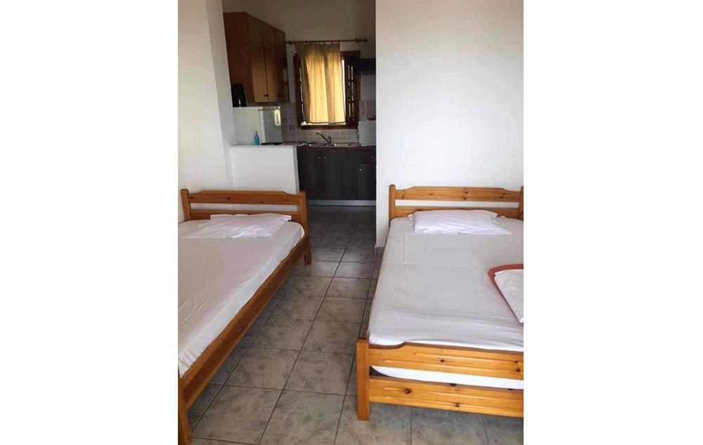 Opis: Poseduje studija namenjena za smeštaj dve do četiri osobe, smeštena u prizemlju i na prvom spratu. Svaka od smeštajnih jedinica ima po dva francuska ležaja po grckim standardima (širine 1.20 ), opremljen kuhinjski deo, kupatilo/wc, terasu, TV,WIFI, A/C, čije se korišćenje naplaćuje 6€ po danu.