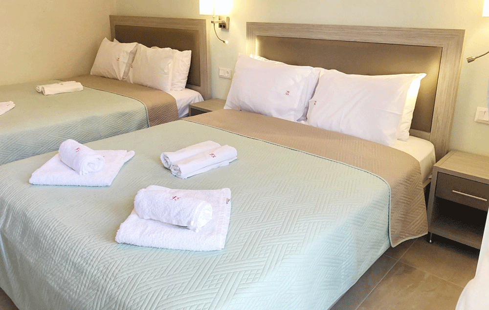 Opis: Palmera je hotel apartmanskog tipa. Smeštajni kapaciteti se nalaze na prvom ili drugom spratu objekta, a namenjeni su za smeštaj od dve do pet osoba. Većina studija/apartmana ima direktni pogled na more, a svaki od njih ima kompletno opremljen kuhinjski deo, mikrotalasnu, kupatilo/wc, terasu, TV, WiFi internet i klima uređaj (uz doplatu na licu mesta od 6€ dnevno).