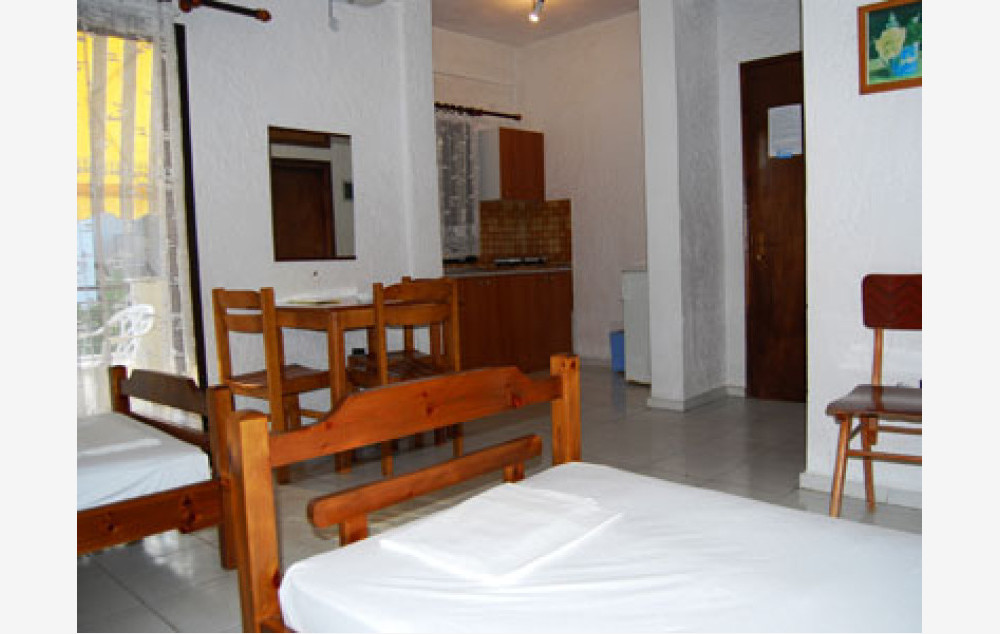 Manji dvokrevetni + 1 studiji (STD 1/2, STD 1/2+1) se nalaze u malo izdignutom prizemlju i na prvom spratu. Lepe i velike terase (sa garniturom za sedenje) gledaju ka vrtu. Studiji su manji, ali funkcionalni i u njima se pored standardnog ležaja, nalazi i prošireni ležaj (francuski ležaj po grčkim standardima-120 cm) na kojem može spavati jedan od roditelja sa detetom. Pored čajne kuhinje sa odgovarajućim posudjem i malim frižiderom (40 l sa komoricom za led) studio je opremljen TV-om, klima uredjajem (uz doplatu na licu mesta (opcija), 5 eur dnevno po studiju), wi – fi Iinternetom, ima malo kupatilo i lepu terasu sa garniturom za sedenje. Ležaljke i suncobrani oko bazena se ne naplaćuju. Studiji su ograničeni na maksimum dve odrasle osobe i dete dodvanaest godina (koje deli prošireni ležaj sa roditeljem). Veličina studija je cca 16 kvm + terasa.