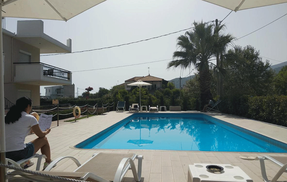 Opis: Smeštajne jedinice vile Filipos se nalaze na visokom prizemlju i na prvom spratu. Vila poseduje studie, koji imaju jedan bračni ležaj po grčkom standardu i jedan ili dva singl ležaja, a duplex apartmani dva bračna ležaja po grčkom standardu i jedan ili dva singl ležaja. U nekim studijima postoje fotelje na razvlačenje na kojima može boraviti dete do 5 godina, bez doplate. Svi imaju kuhinjski deo, kupatilo/wc, balkon sa garniturom za sedenje sa pogledom na bazen ili vrt, TV, WiFi internet i klima uređaj (uz doplatu na licu mesta od 6€ dnevno).