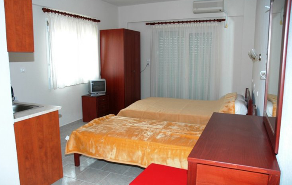 Opis: Vila Tasos u ponudi ima dvokrevetne, trokrevetne i četvorokrevetne studije na visokom prizemlju i drugom spratu. Sve smeštajne jedinice poseduju opremljen kuhinjski deo, kupatilo, terasu, TV, klima uređaj (uz doplatu na licu mesta od 7€ dnevno).