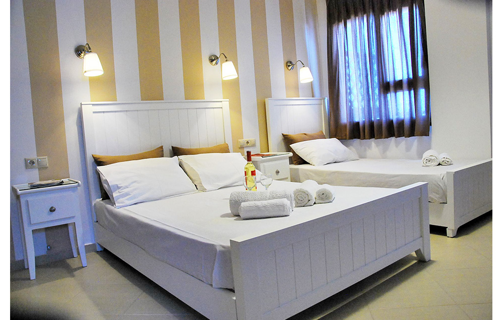 Opis:Trokrevetni i četvorokrevetni apartmani (1/3 APP, 1/4 APP) sastoje se od dve spavaće sobe (od kojih se kroz jednu ulazi u apartman, ima dva standardna ležaja ili francuski i bez vrata ka prolaznoj kuhinji, a druga ima izlaz na terasu i ima francuski ležaj ili dva standardna), male kuhinje, kupatila i velike terase sa garniturom za sedenje sa bočnim pogledom na more, okrenute prema maloj ulici i plaži.Svi apartmani su opremljeni klima uredjajem (uz doplatu na licu mesta (opcija), 8 eur dnevno po apartmanu), wi – fi Internetom i TV - om. Veličina apartmana je cca 35 kvm + terasa.Vila Rigakis Mol je B kategorije, nema peškire i nema mogućnost sopstvenog parkinga.