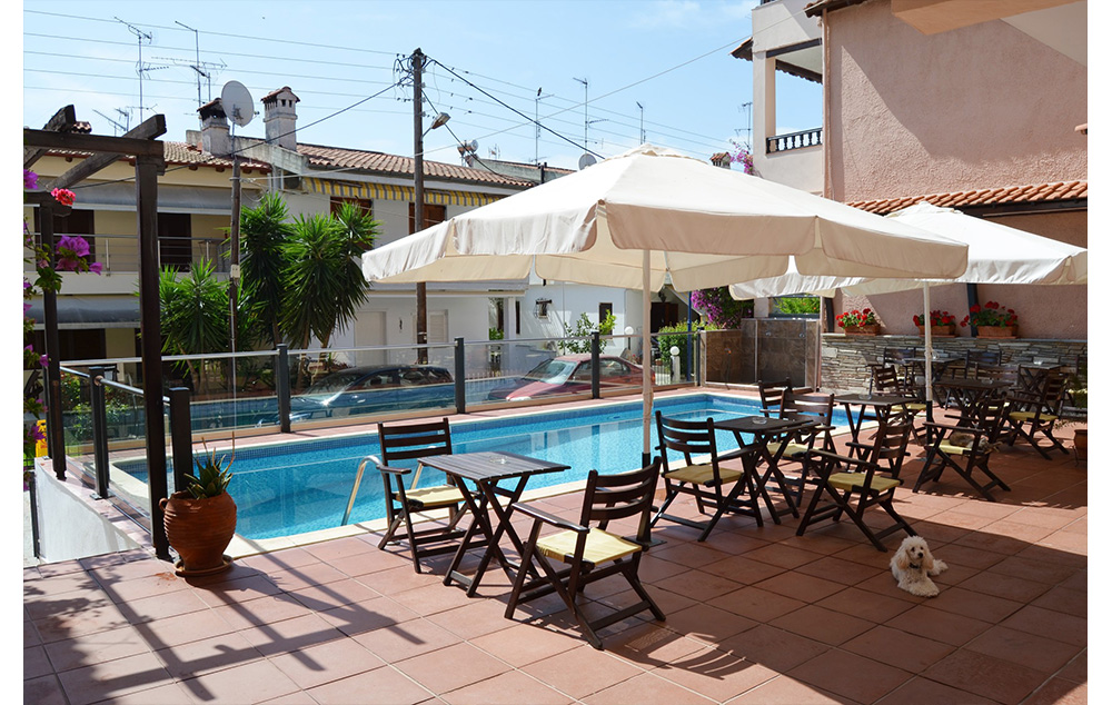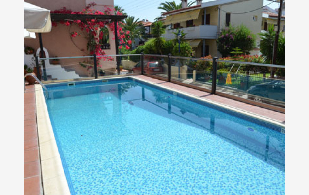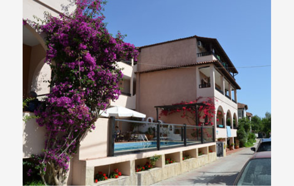 Opis:Sastoji se od glavne zgrade sa recepcijom, lobijem sa kaminom i barom i nekoliko bungalova sa po četiri do šest studija. Bungalovi su smešteni u prelepom, velikom, mediteranskom vrtu sa puno zelenila i cveća u koji se savršeno uklapaju veliki i dečiji bazen, kao i igralište za decu. Zahvaljujući prelepom ambijentu i odličnoj lokaciji u čijoj neposrednoj blizini su prodavnica i pekara, objekat je idealan za porodice sa jednim detetom, kao i parove koji će pronaći tihi kutak u uzavrelom Pefkohoriju.