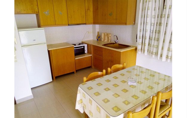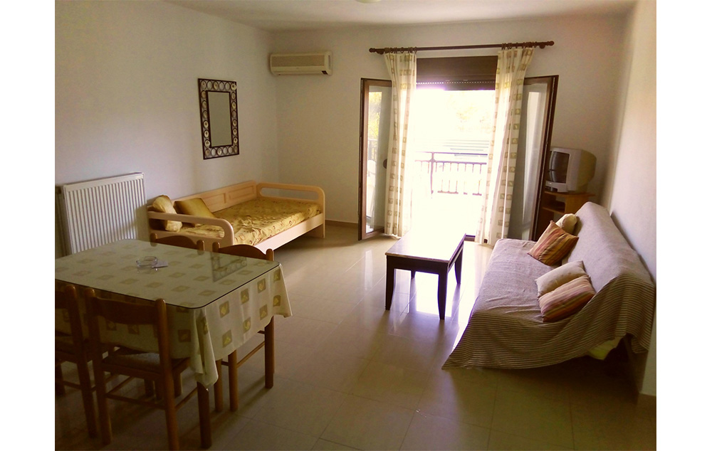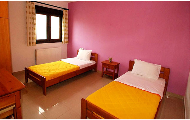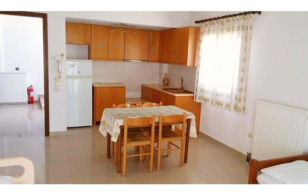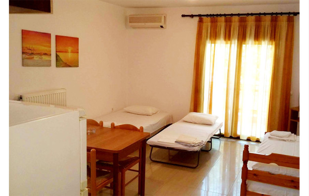 Vila Maria se nalazi u lepom mediteranskom vrtu, na idealnoj lokaciji, oko 800 metara od centra grada, na svega oko 170 metara od prelepe i jedne od najpoznatijih plaža na ostrvu, plaže Megali Amos (Velika plaža). Dvokrevetni i trokrevetni studiji vile Maria su smešteni na prvom spratu, a četvorokrevetni apartman na malo izdignutom prizemlju i svi su sa pogledom na dvorište. Opremljeni su klima uredjajem (uz doplatu na licu mesta (opcija), 8 eura dnevno po studiju/apartmanu), wi - fi Internetom i TV - om. Dvokrevetni i trokrevetni studiji sadrže opremljenu malu kuhinju sa delom za spavanje sa dva, odnosno tri standardna ležaja, kupatilo i lepu terasu sa garniturom za sedenje. Veličina studija je cca 18 – 20 kvm + terasa. Četvorokrevetni apartman se sastoji dnevnog boravka u kojem se nalazi dobro opremljena kuhinja (veliki frižider sa zamrzivačem, šporet sa rernom...) trpezarijski sto, ugaona sofa na kojoj može spavati dvoje dece do 12 godina, spavaće sobe sa francuskim ležajem, kupatila i velike terase sa garniturom za sedenje i pogledom na vrt. Veličina apartmana je cca 33 kvm + terase. Vila Maria je B kategorije, ima peškire i javni besplatni parking preko puta vile. Najbliži mini market je ispred vile, a autobuska stanica u neposrednoj blizini. Vila je idealna za mlade zbog blizine grada, ali i za porodice, jer je plaža u neposrednoj blizini, ima zidani roštilj i dvoršte koje je na raspolaganju deci.
